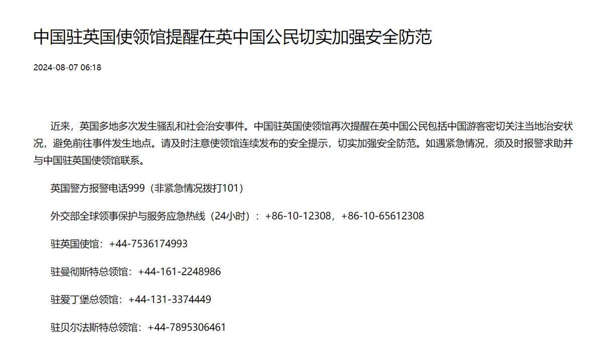 8月7日,中国驻英国使领馆发文提醒在英中国公民切实加强安全防范:近来,英国多地多次发生骚乱和社会治安事件。中国驻英国使领馆再次提醒在英中国公民包括中国游客密切关注当地治安状况,避免前往事件发生地点。请及时注意使领馆连续发布的安全提示,切实加强安全防范。如遇紧急情况,须及时报警求助并与中国驻英国使领馆联系。