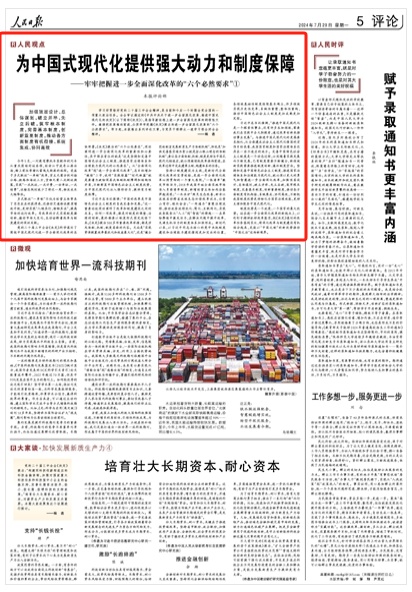 《决定》提出的“六个必然要求”,深刻阐明进一步全面深化改革的重要性和必要性,其中排在首位的就是“这是坚持和完善中国特色社会主义制度、推进国家治理体系和治理能力现代化的必然要求”。从“全面深化改革”到“进一步全面深化改革”,总目标增加“继续”二字,说明“实践续篇”“时代新篇”就是要着力破除深层次体制机制障碍和结构性矛盾,不断彰显中国特色社会主义制度优势,为中国式现代化注入强劲动力、提供有力制度保障。【全文】