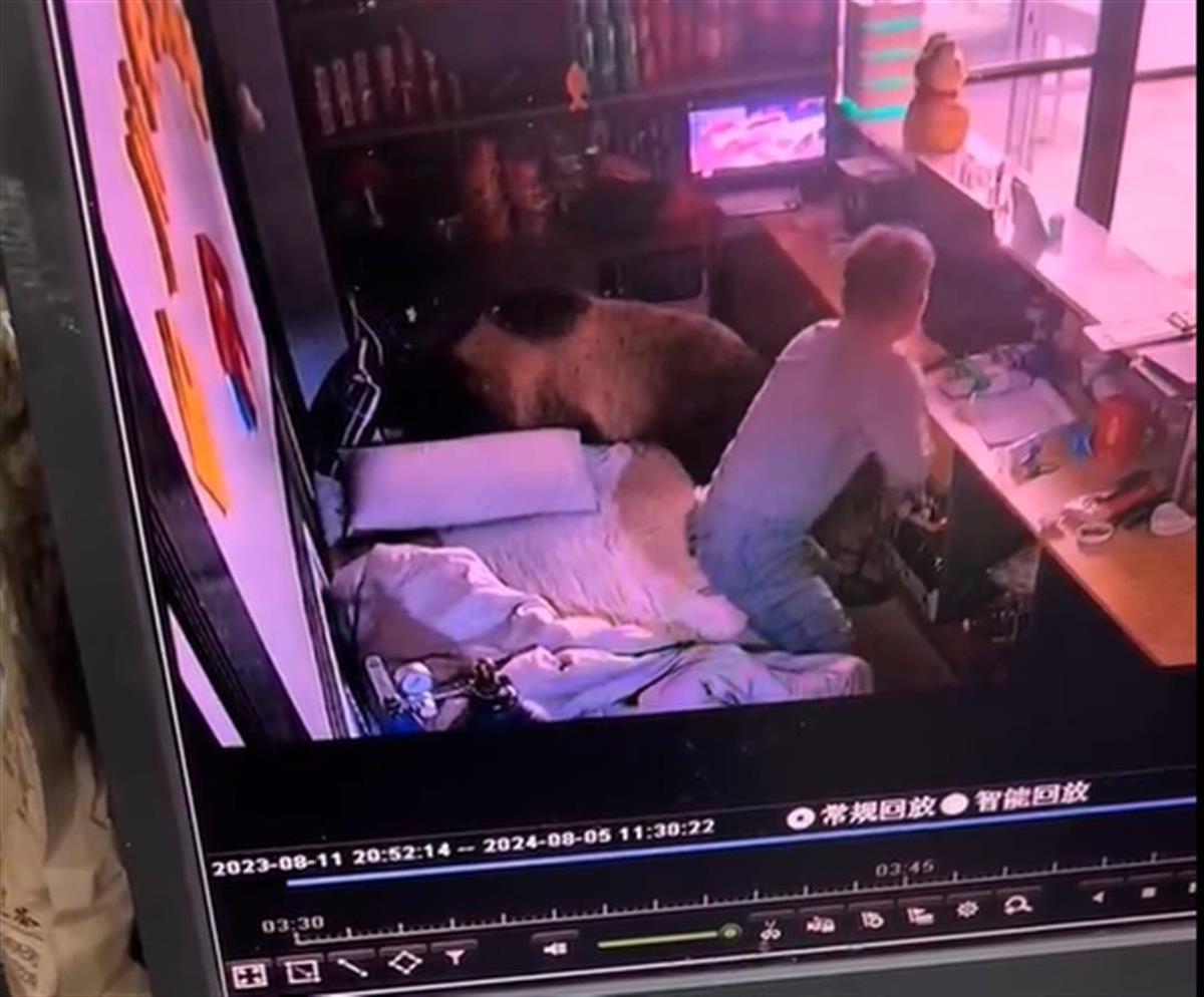 网传监控录像显示,8月5日,一头棕熊扒开门进入路边一商户,在柜台翻找东西。一男子正在柜台旁熟睡,感觉到异样后抬头发现了棕熊,赶紧从被窝起身取了手机,迅速离开。录像显示,播放该段监控视频的电脑旁办公桌上,摆有“雁石坪镇平安办”的通讯录。