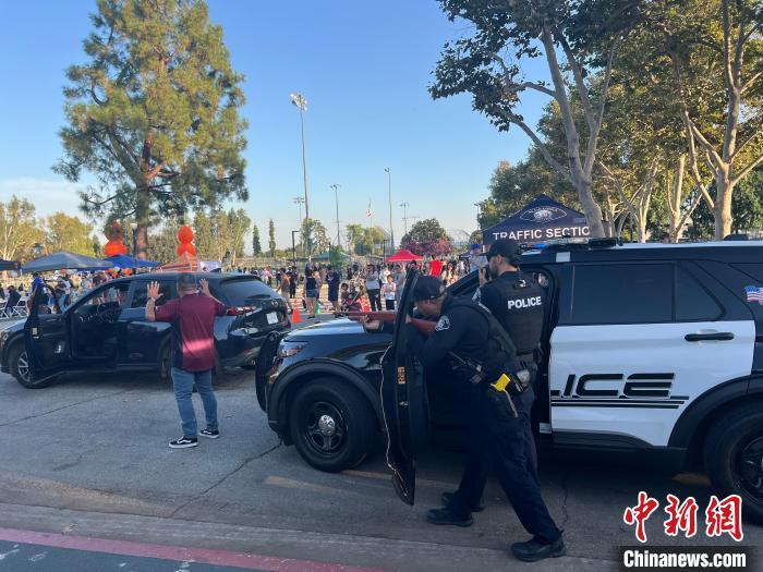 美国加利福尼亚州洛杉矶郡华人聚居城市阿罕布拉市警察局,今年将警民“守望相助之夜”活动从往年的警察局门前搬到了场地更为宽阔的社区公园。阿罕布拉市警察局警督洛尼·卡斯蒂欧(Rodney Castillo)在接受中新社记者采访时说,今年警民“守望相助之夜”从当天下午6点开始,持续两个半小时,设有警车警械等警用装备展示和体验、警犬工作演示等项目,警员还现场展示如何拦截并拘捕“嫌疑人”,活动内容比以往丰富、现场民众也更多了。