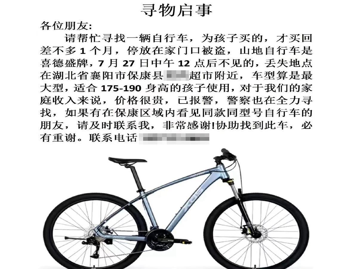 正在犹豫间,一名过路市民向交警反映,近几天在网上看到一则本地群众发的“寻物启事”,称“丢失了一辆蓝色山地自行车”,并附有自行车的照片。交警上网调出“寻物启事”,通过比对,发现与眼前的这辆山地自行车一模一样。