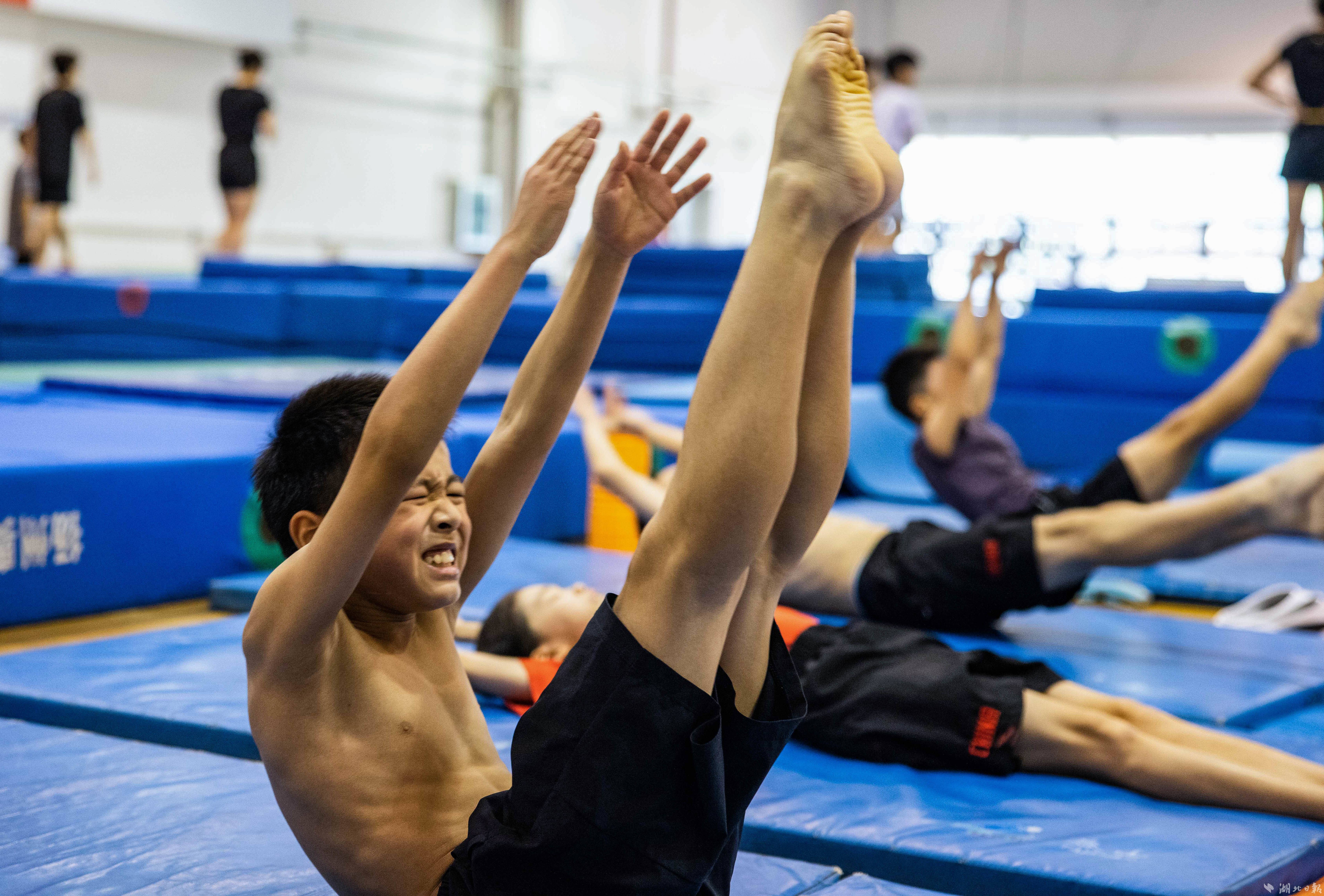8月6日,刚进省队的体操小运动员们在进行基本功训练。