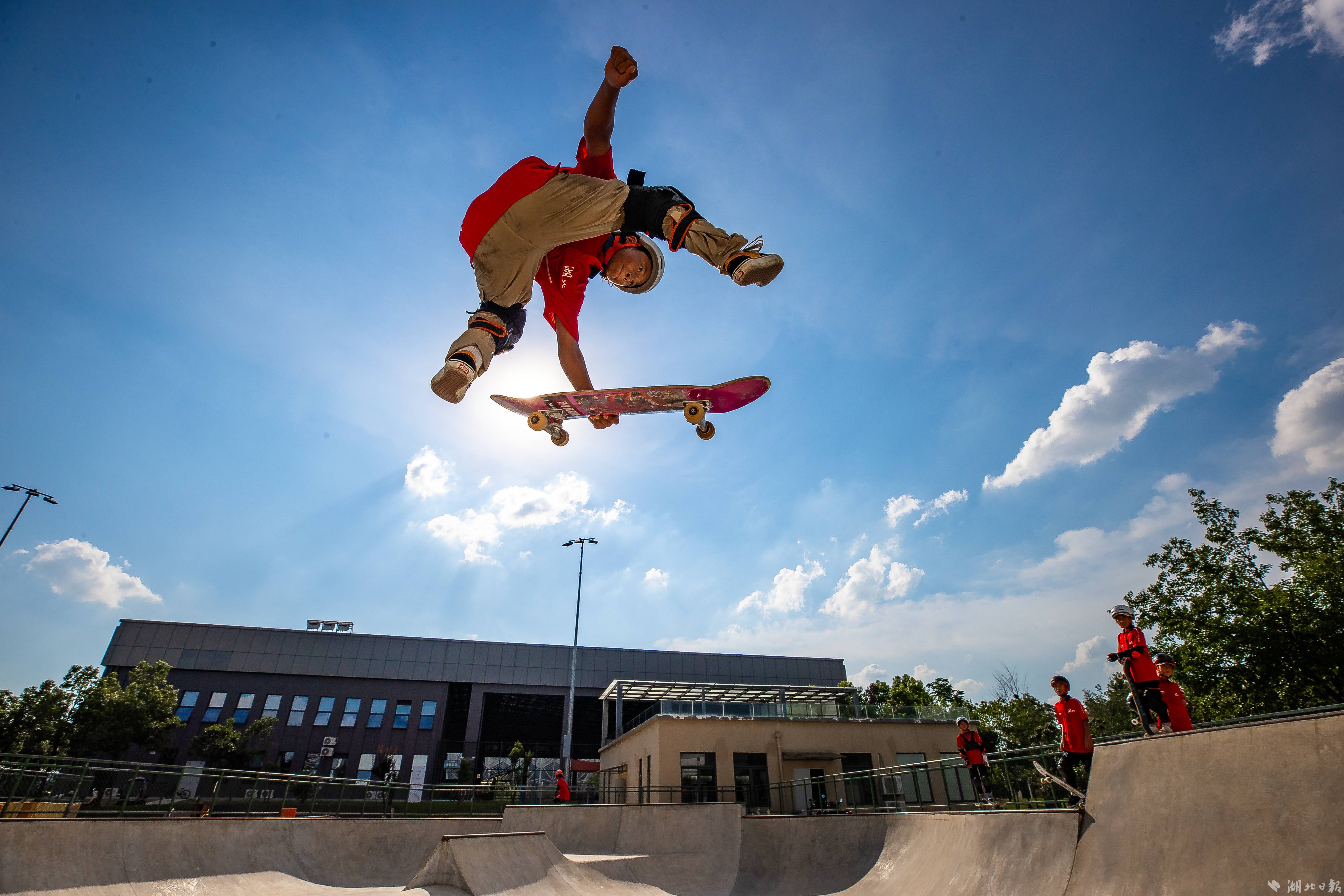8月6日,滑板小运动员在烈日下做出腾跃动作。