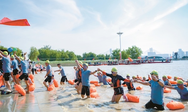 8月8日,第49届武汉7·16渡江节拉开序幕,今年的主题是“万里长江横渡,极目楚天舒”。当天早上6时30分还没到,武汉汉阳门江边已经站满了人。千余名运动健儿气宇轩昂准备着热身动作,岸边锣鼓声、加油声、欢呼声交织,将活动气氛推至顶峰。
