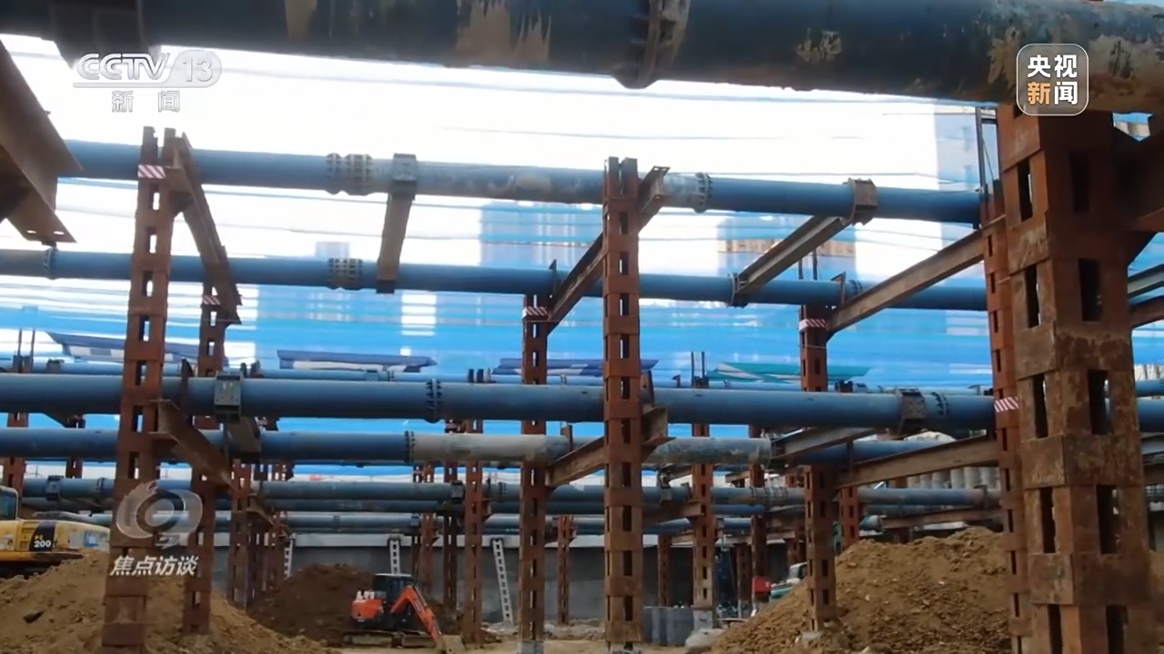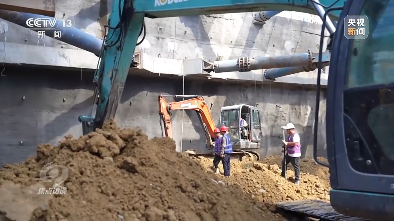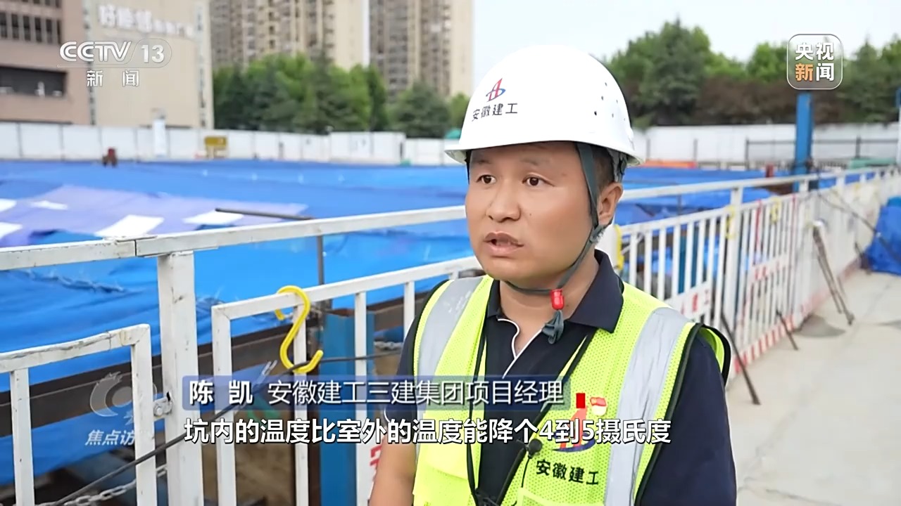 安徽建工三建集团项目经理 陈凯:坑内的温度比室外的温度能降4℃到5℃。第二方面围墙周围、基坑周边都有喷淋系统,这是一个水雾,可以起到降温作用。第三个是基坑作业面,用冰块配合鼓风机给工人作业降温。