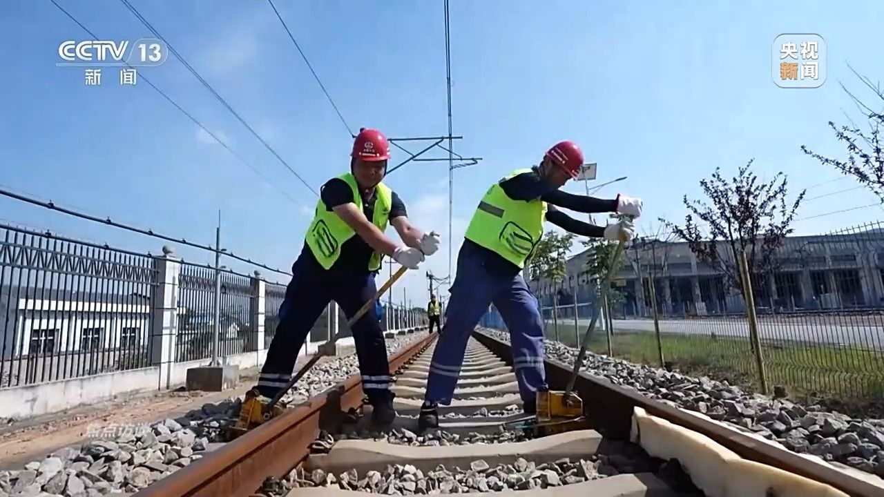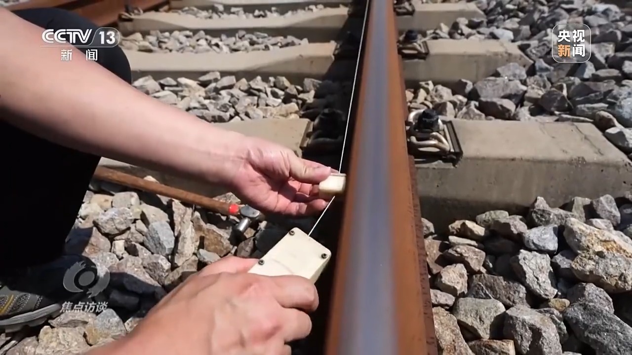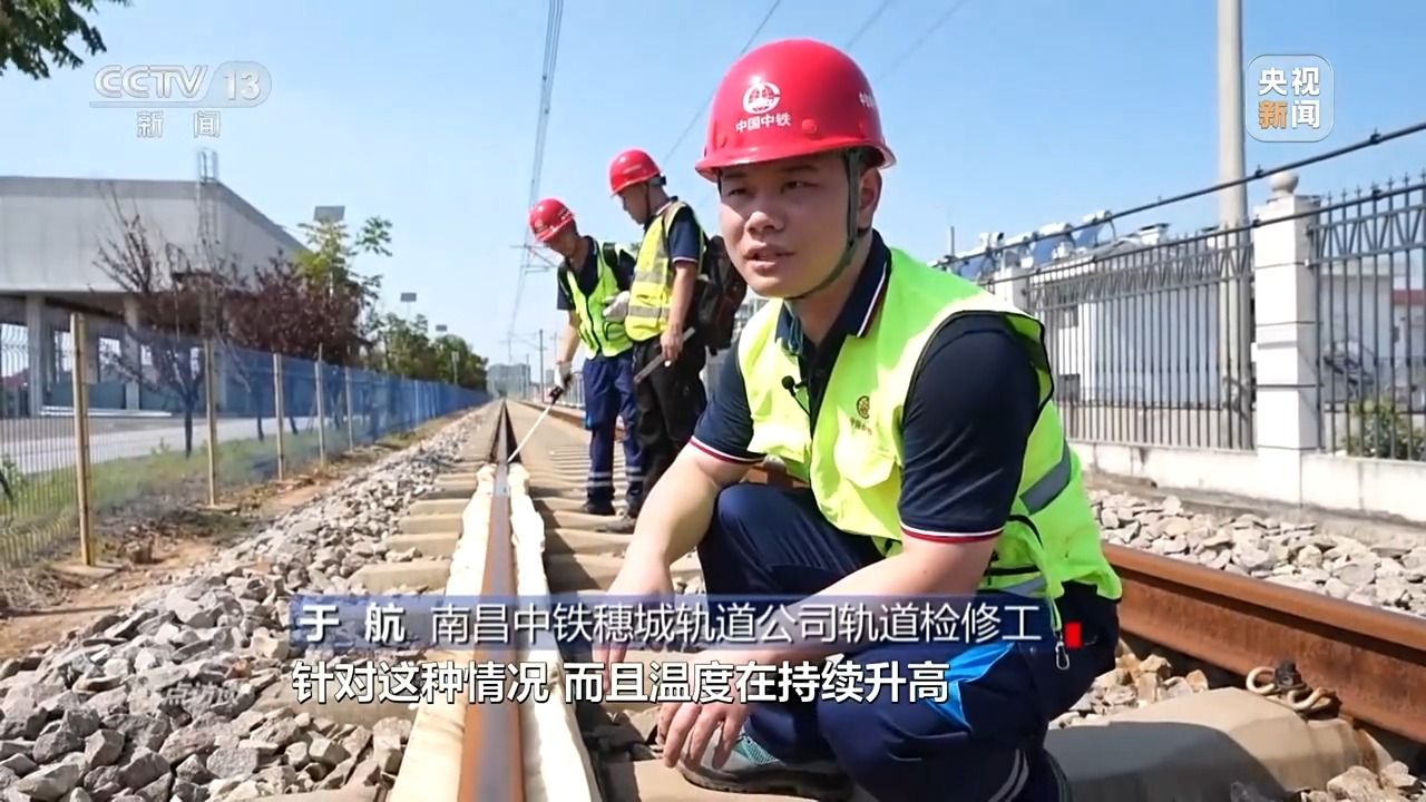 南昌中铁穗城轨道公司轨道检修工 于航:刚刚测量的轨向偏差值是5毫米,针对这种情况,而且温度在持续升高,我们会提前采取一些预防措施。像现在加的海绵条,通过这种简单直接的浇水降温法给钢轨降温。