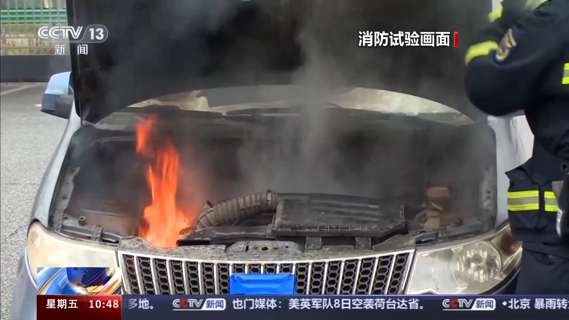 针对夏季炎热易发生的燃油汽车自燃事故,消防员接下来测试这款网上热卖的所谓“车载灭火神器”——灭火车贴。消防员按照使用说明,在试验车辆的引擎盖内侧贴上一块灭火车贴,然后引燃发动机舱,模拟汽车发生自燃。