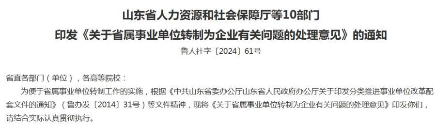 中新网北京8月9日电(张钰惠)近日,山东省人力资源和社会保障厅等10部门印发《关于省属事业单位转制为企业有关问题的处理意见》的通知(以下简称《意见》),引发广泛关注和讨论。人事劳动关系转换、社会保险关系转换、已离退休人员生活待遇的发放、原编制内女性工作人员退休年龄……《意见》对上述问题作出了解释。