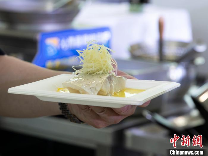 8月9日,第四届中国(宁夏)葡萄酒文化旅游博览会餐酒搭配活动在银川启动。本次活动由宁夏贺兰山东麓葡萄酒产业园区管委会联合世界中餐业联合会共同举办,邀请各地名厨将中餐与葡萄酒搭配结合,现场烹制菜肴。图为苏菜大师张献民展示以葡萄酒蒸制的菜品“姜丝白鱼”。中新社记者 杨迪 摄