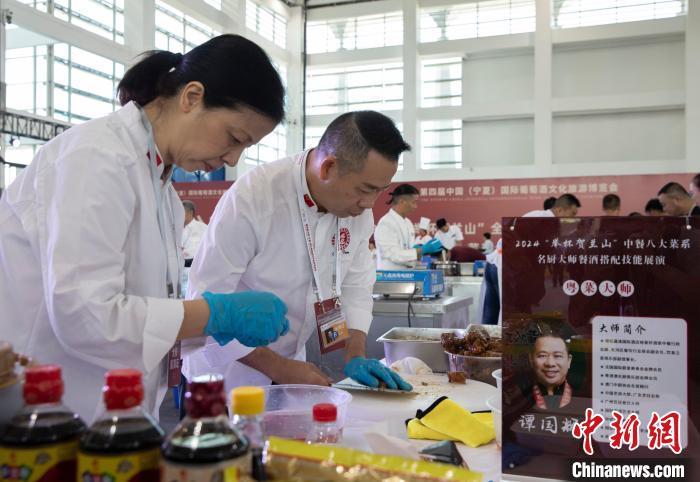 8月9日,第四届中国(宁夏)葡萄酒文化旅游博览会餐酒搭配活动在银川启动。本次活动由宁夏贺兰山东麓葡萄酒产业园区管委会联合世界中餐业联合会共同举办,邀请各地名厨将中餐与葡萄酒搭配结合,现场烹制菜肴。图为粤菜大师谭国辉(右)制作菜品。中新社记者 杨迪 摄