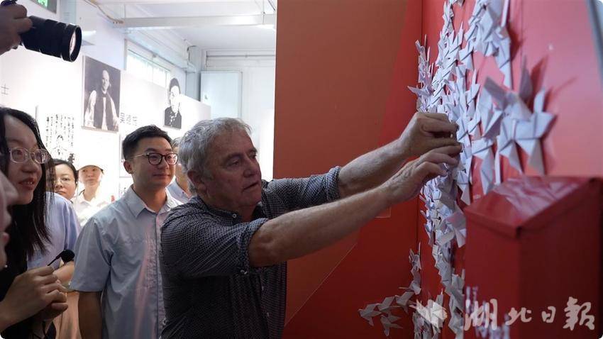 8月9日,率团来汉访问的新西兰克赖斯特彻奇市市长菲尔·梅杰,专程来到八路军武汉办事处旧址纪念馆。在《为了正义与和平——武汉抗战中的国际友人特展》互动区,他郑重贴上一枚“和平鸽”折纸,以此致敬追求和平与正义的国际友人,其中就包括新西兰的路易·艾黎。