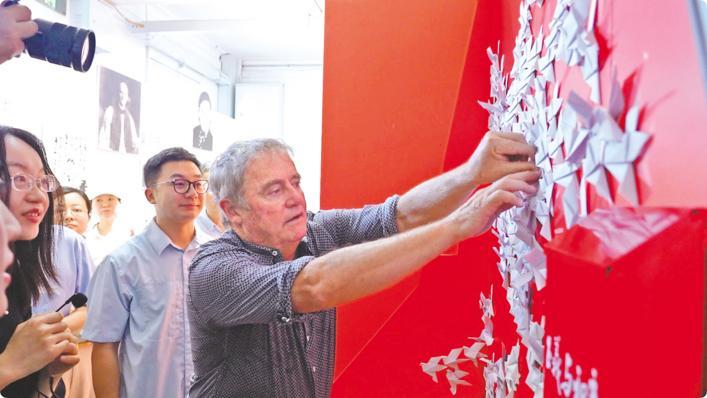 8月9日,率团来汉访问的新西兰克赖斯特彻奇市市长菲尔·梅杰,专程来到八路军武汉办事处旧址纪念馆。在《为了正义与和平——武汉抗战中的国际友人特展》互动区,他郑重贴上一枚“和平鸽”折纸,以此致敬追求和平与正义的国际友人,其中就包括新西兰的路易·艾黎。