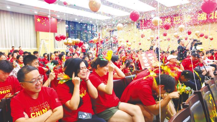 8月9日晚,省奥体中心观赛现场,运动员、教练员为昌雅妮加油助威。 (湖北日报全媒记者 柯皓 摄)