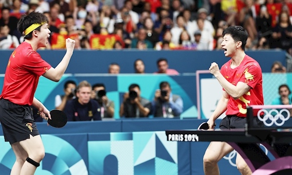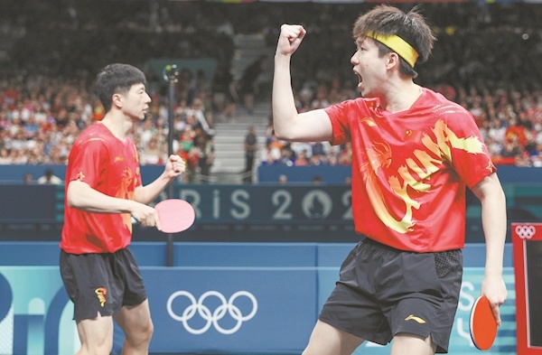 9日,巴黎奥运会赛场,乒乓球男团决赛在中国队和瑞典队之间上演。国乒男团最终以3:0,拿下该项目奥运会五连冠。图为中国队组合马龙(右)/王楚钦在比赛中。 新华社发