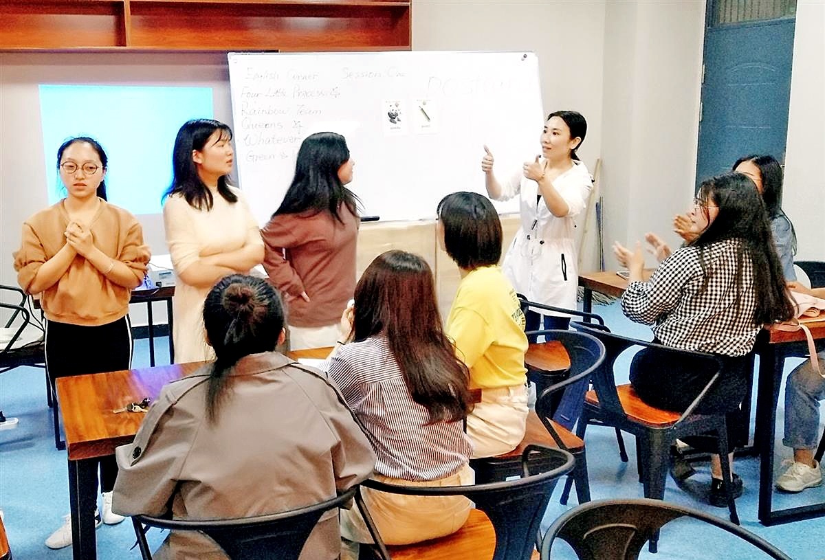 杜娟子(右三)利用晚自习组织“英语角”活动 通讯员供图