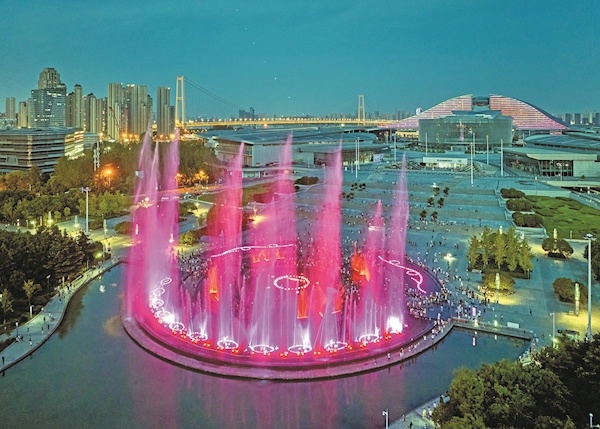 8月9日19时20分,伴着夏夜的晚风,位于武汉市汉阳区的国博中心音乐喷泉准时开启。高达80米的喷泉伴随着动人的旋律翩翩起舞,1300多颗喷头交织出千变万化的水幕,美不胜收,为市民游客带来了一场视听盛宴。 楚天都市报极目新闻记者宋枕涛摄