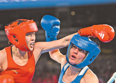 当地时间8月8日,中国队选手常园(左)在巴黎奥运会女子拳击54公斤级决赛中。 新华社记者 江文耀摄 |