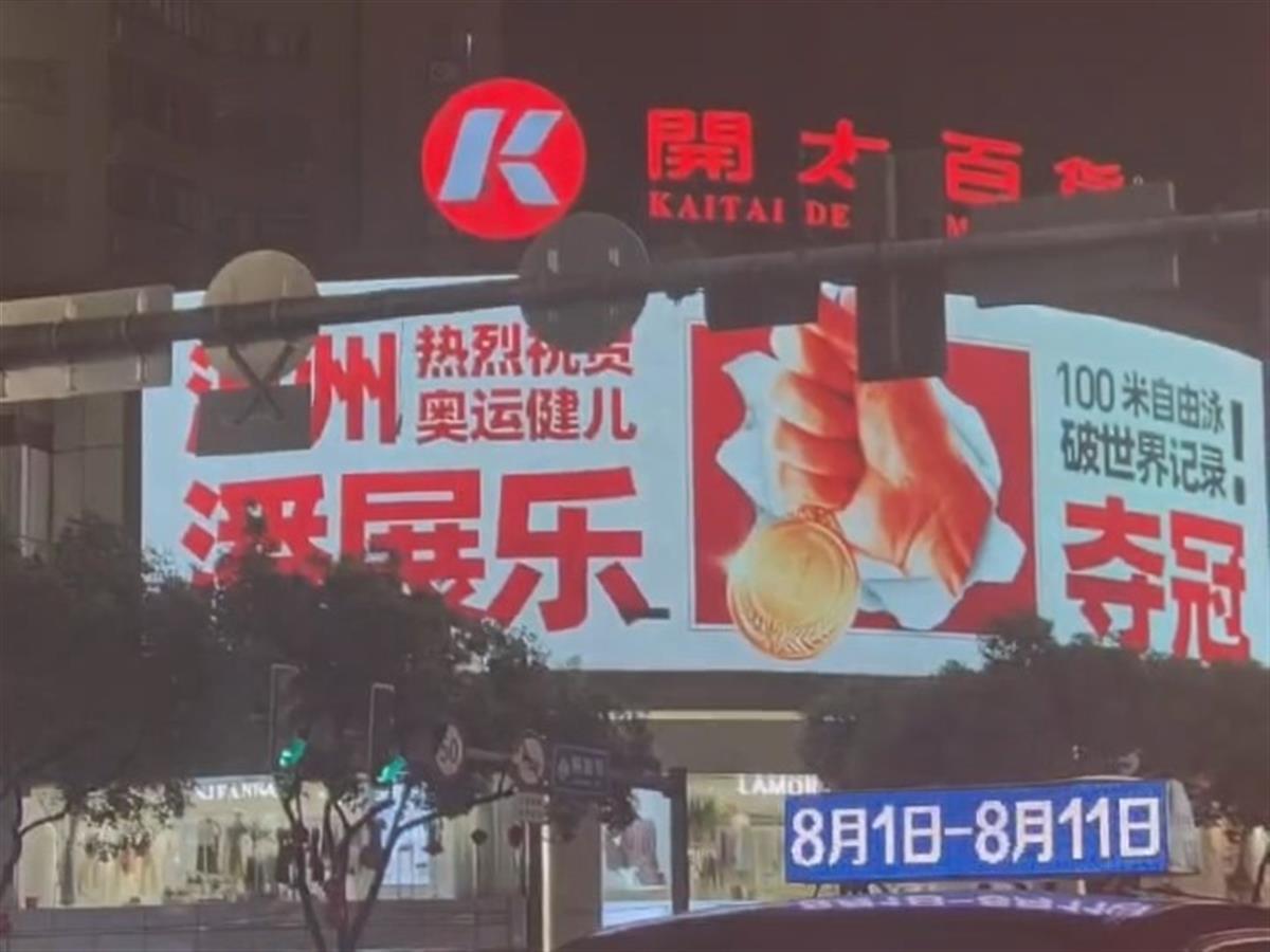 为了庆祝潘展乐夺冠,老家温州多个商场大屏以祝贺海报或视频形式滚动播放这一喜讯,出租车顶的广告位也尽是对他的祝贺。
