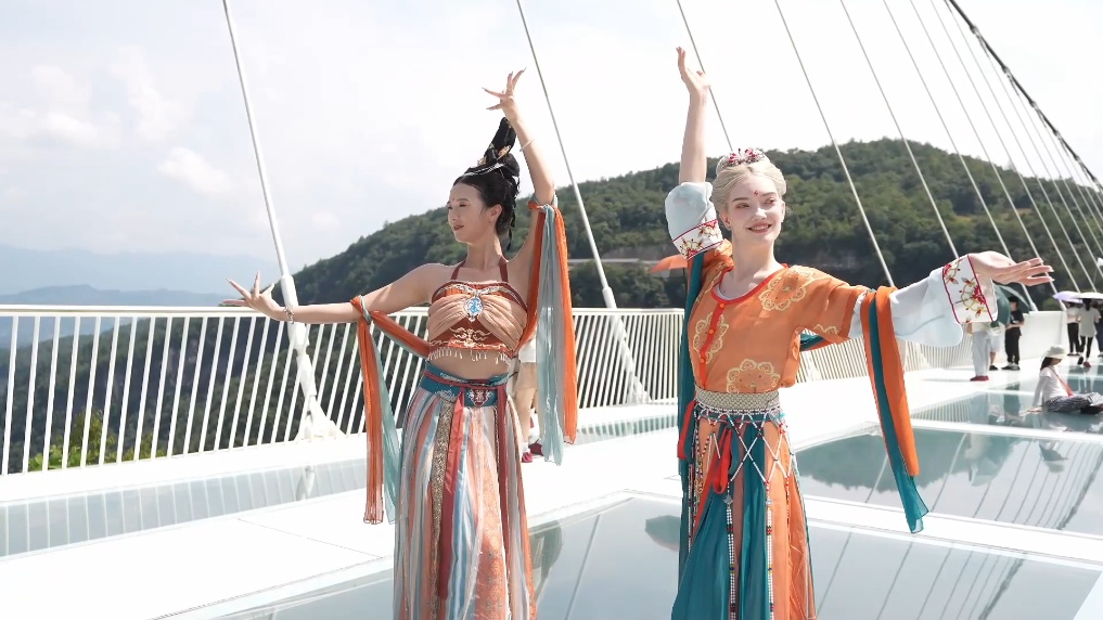 8月10日,农历七月初七,是中国传统节日七夕节。在湖南张家界大峡谷景区,舞蹈演员化身牛郎与织女翩翩起舞。一些外国游客穿上汉服,演绎“牛郎织女鹊桥会”,感受浓浓中国传统文化。