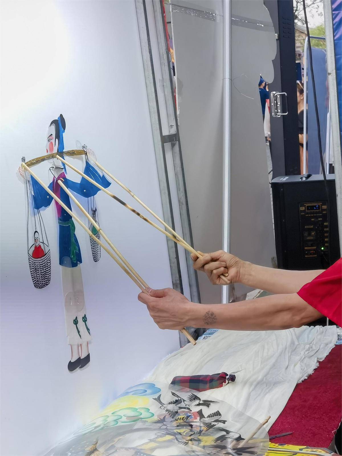 云梦皮影传承人陈红军展示《鹊桥相会》里的牛郎。
