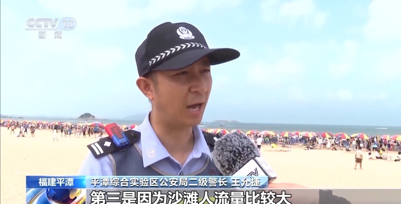 平潭综合实验区公安局二级警长 王允捷:我们不建议到没有安全防护措施的海滩进行游泳,因为看似平静的海面,在涨退潮的时候,下面有很强的离岸流,很容易把人往外拉,造成溺水事故。