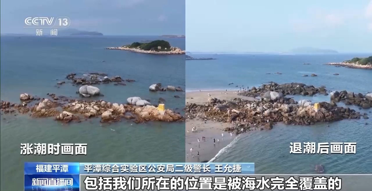 平潭综合实验区公安局二级警长 王允捷:大家看这个龟模屿,在退潮的时候人是可以走上去的,在涨潮的时候,包括我们所在的位置是被海水完全覆盖的,所以大家出来游玩的时候一定要注意潮汐的变化。广大游客如果对潮汐表不清楚的,可以到各大搜索引擎搜索潮汐表。如果您一旦被困在无人的岛礁上,不要轻易攀爬,容易发生割伤和摔倒,不要轻易下水,容易发生溺水事故,请在第一时间拨打110,我们有专业的队员进行救援。