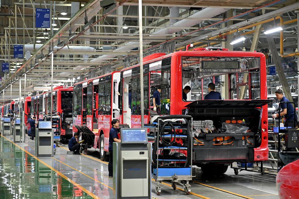 宇通客车新能源厂区承装车间的海外总装线(7月29日摄)。新华社记者 李鑫 摄