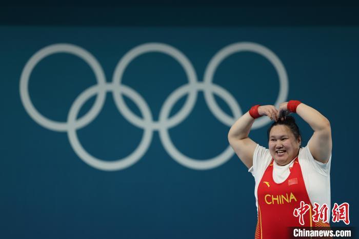 当地时间8月11日,在巴黎奥运会举重女子81公斤以上级比赛中,中国队选手李雯雯以抓举136公斤、挺举173公斤、总成绩309公斤获得金牌。图为李雯雯“比心”庆祝胜利。 中新社记者 富田 摄