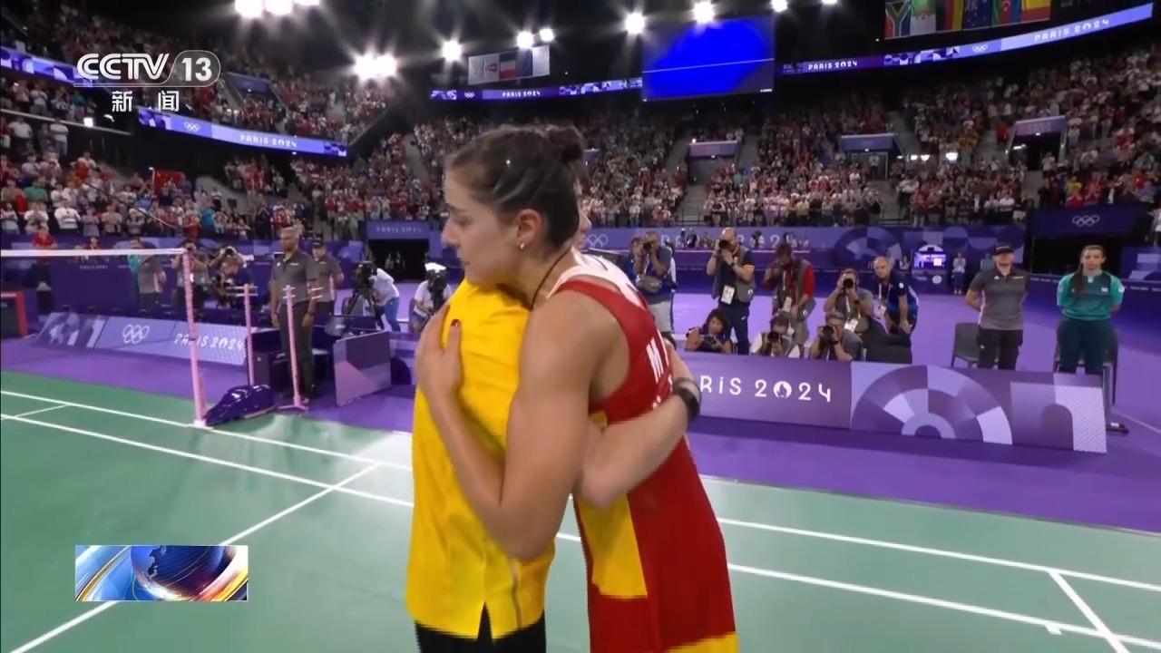 第二天,在颁奖典礼上,获得银牌的中国羽毛球选手何冰娇在举起奖牌的同时,另一只手,则拿起了一枚西班牙奥委会的徽章。
