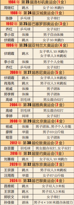 陈静夺得我国第一枚乒乓球女子单打奥运金牌,高崚夺得我国第一枚羽毛球混双金牌,李婷夺得我国第一枚网球奥运金牌,杨威、郑李辉、程菲是我国首次夺得体操男、女团体奥运冠军的功勋成员,伏明霞、李小双、乔红、赵芸蕾等加冕奥运“多金王”……