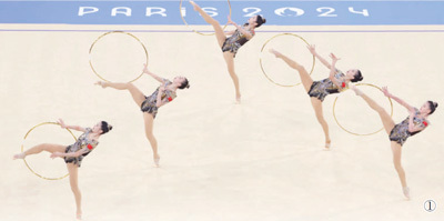 图①:中国队在艺术体操集体全能决赛中。 本报记者 陶相安摄 |
