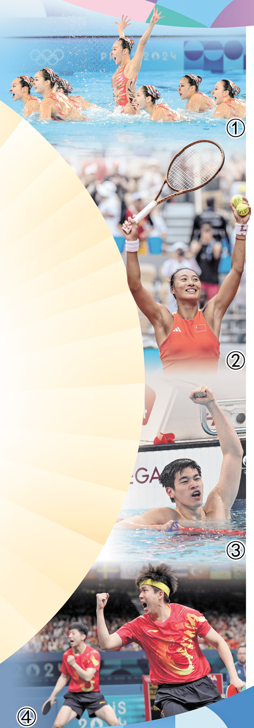 图①:当地时间8月7日,中国队在巴黎奥运会花样游泳项目比赛中。 本报记者 陶相安摄 图②:当地时间8月3日,中国队选手郑钦文在巴黎奥运会网球女单决赛后庆祝胜利。 环球时报记者 李 昊摄 图③:当地时间7月31日,中国队选手潘展乐在巴黎奥运会男子100米自由泳决赛后庆祝夺冠。 本报记者 雷 声摄 图④:当地时间8月9日,中国队选手王楚钦(前)、马龙在巴黎奥运会乒乓球男子团体决赛中。 环球时报记者 李 昊摄 |