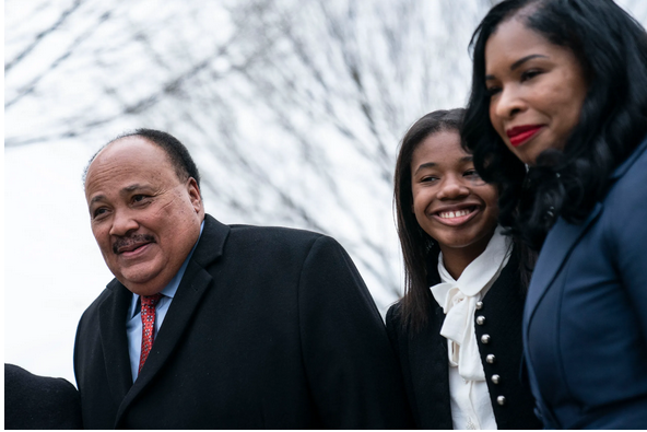 2022年4月4日,马丁·路德·金三世,妻子安德莉亚·沃特斯·金和女儿约兰达·蕾妮·金抵达华盛顿特区的马丁·路德·金纪念馆守夜