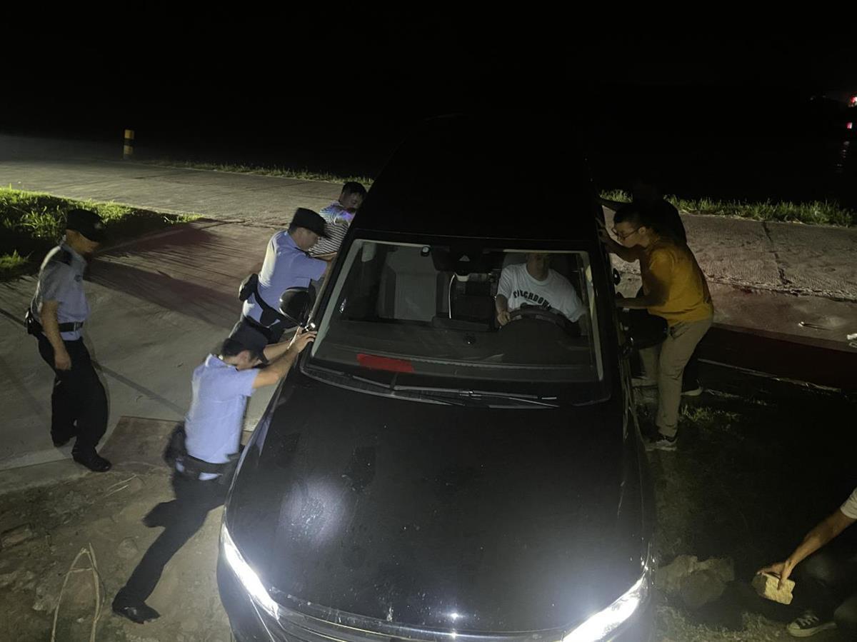 石首市公安局民辅警在巡逻时发现一辆小车卡在台阶下无法动弹