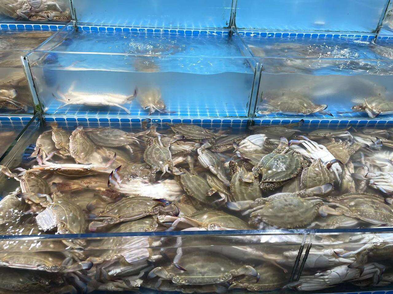 除了水产市场外,记者还走访了盒马鲜生(天城商业中心店),这里的梭子蟹根据大小分为两类售卖,4两-6两的蟹79.9元一斤,3两-4两的则在59.9元一斤。