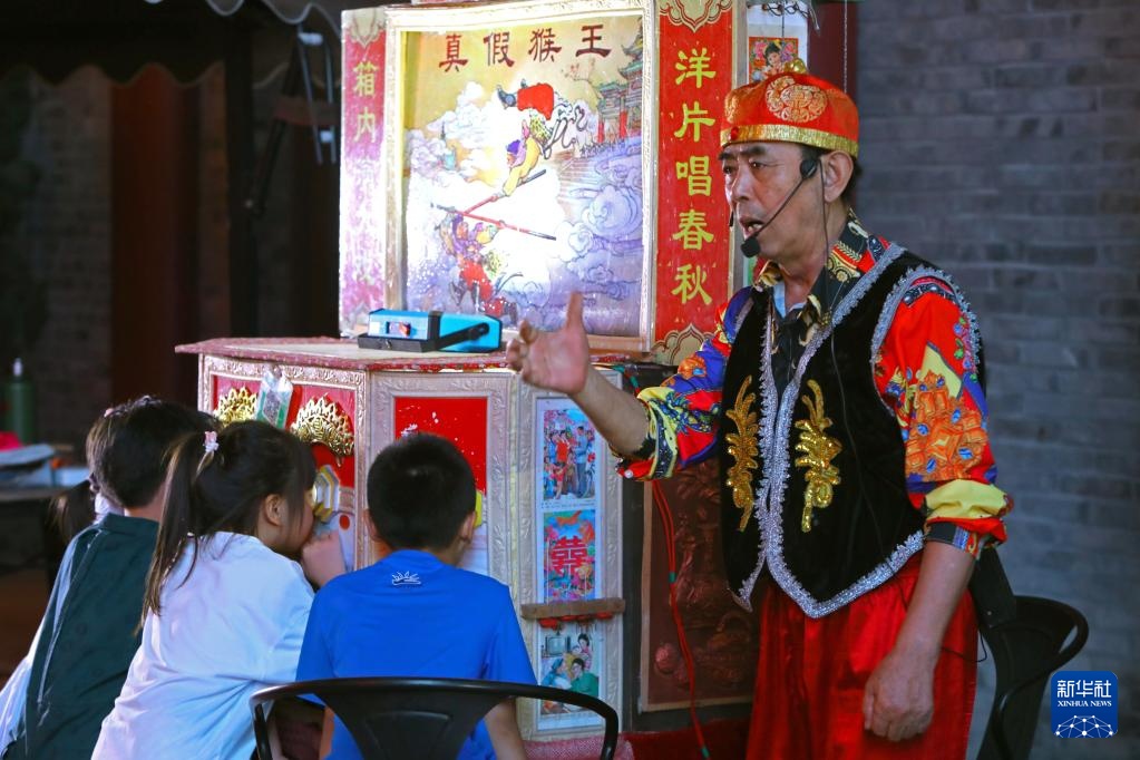 小朋友在辽宁省沈阳市和平区老北市旅游休闲街区观看拉洋片。新华社记者 陈为 摄