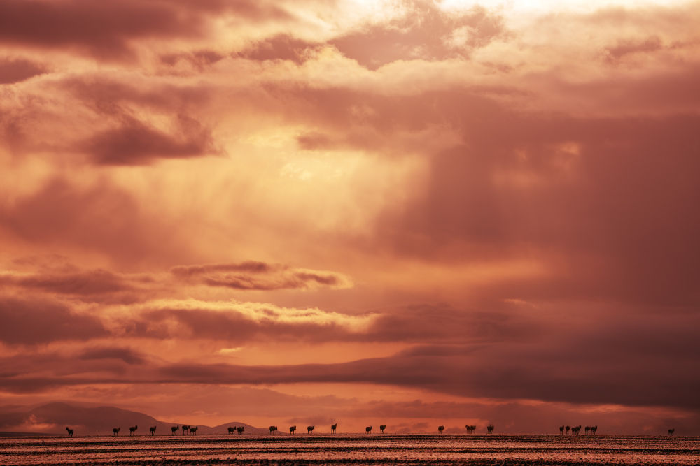 2024年6月15日清晨雪后,在西藏羌塘国家级自然保护区,一群藏羚羊迎着朝霞前行在迁徙路上。