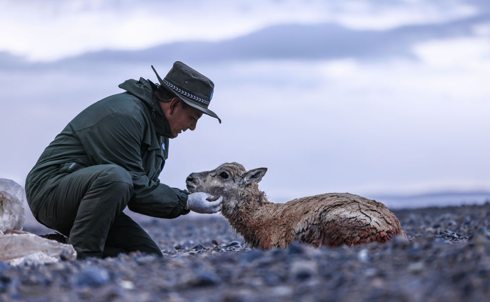 2024年6月14日,野生动物专业管护队员在西藏羌塘国家级自然保护区核心区安抚受伤的母藏羚羊。