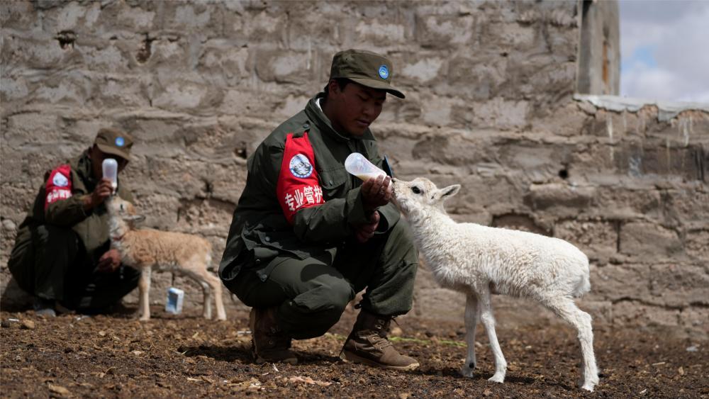 2024年7月13日,西藏那曲市尼玛县措罗木管护站野保员在给白色藏羚羊幼崽喂奶。