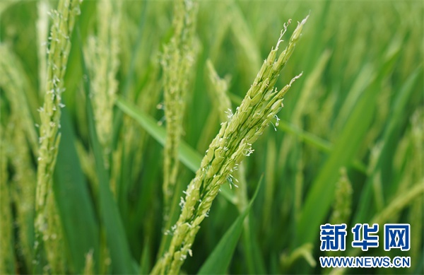制种水稻抽穗扬花。新华网发(陈昆 摄)