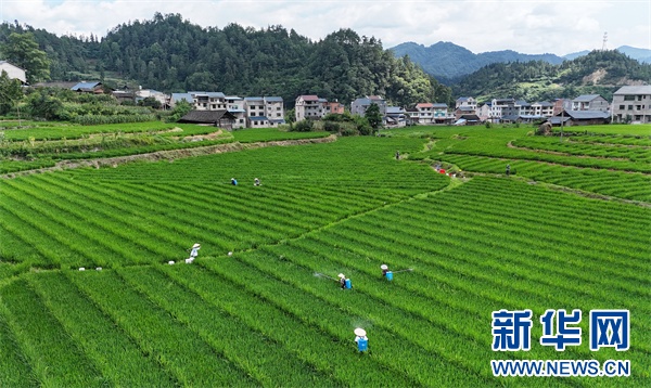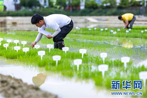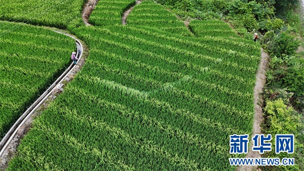 日前,工人在岑巩县的水稻制种基地管护水稻。新华网发(陈昆 摄)