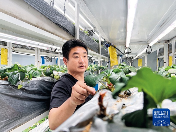 徐纬在草莓“植物工厂”实验室内检查草莓生长情况(2024年5月22日摄)。刘智强摄/本刊
