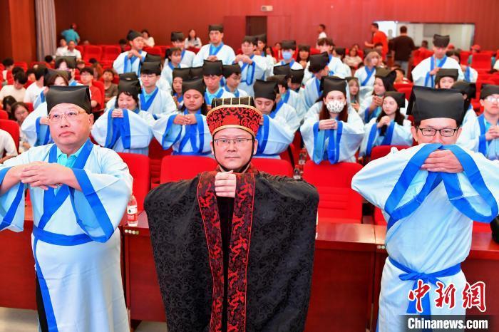 8月13日,2024年台湾学子重走科举路研习营在福州开营,营员们穿上汉服、肃整衣冠,行敬拜先师之礼。 中新社记者 张斌 摄