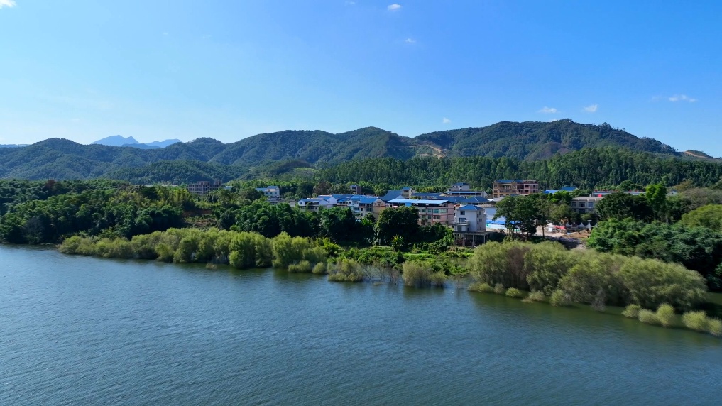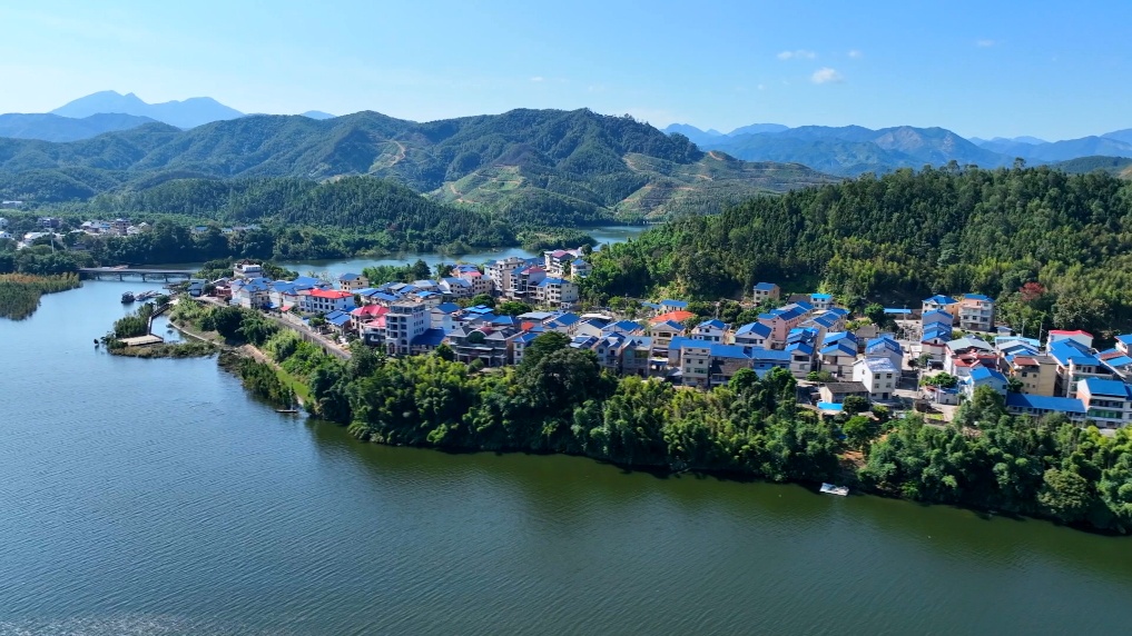俯瞰斜溪村,江岸线绵延不绝,民居错落有致,山水林田湖草等自然资源得到有效保护,一幅生动和谐的和美乡村画卷徐徐展开。