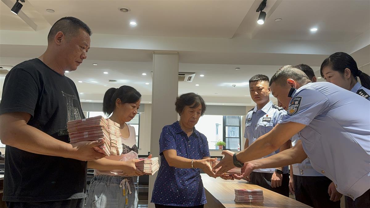8月11日,民警向黄老太返还了被骗的50万元现金(张雪洋 摄)
