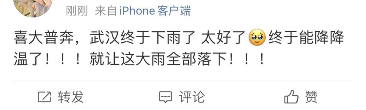 网友们纷纷发帖庆祝:“武汉总算是下雨了!”“很久没有体验过如此清凉的午后了。”“就让这大雨全部落下!”