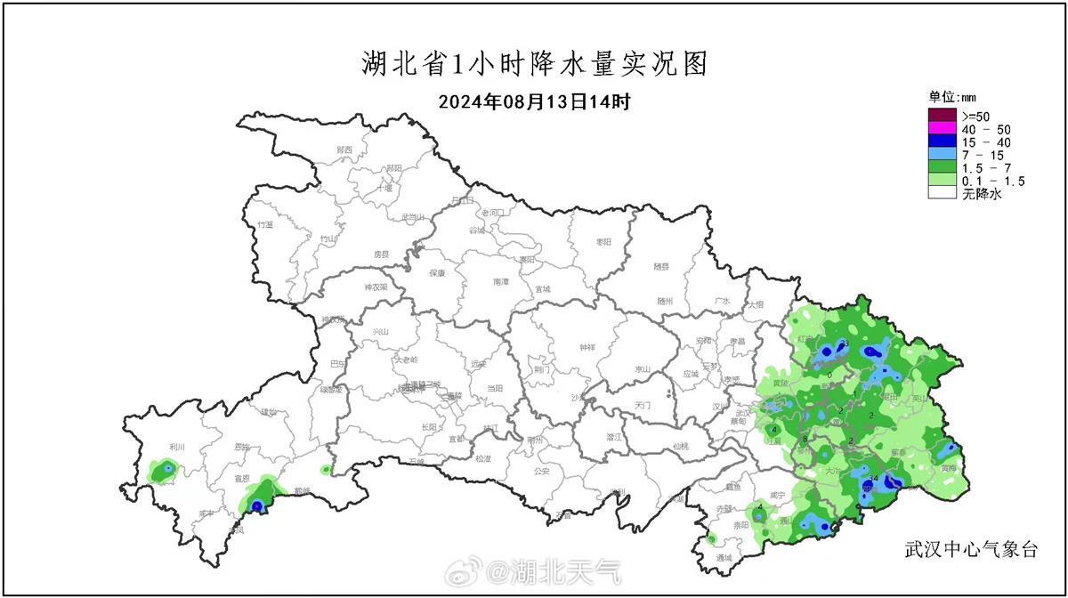 14日08时—15日08时,江汉平原东部、鄂东北、鄂东南多云有分散性阵雨或雷阵雨,局地有短时强降水、雷暴大风等强对流天气;其他地区晴天到多云,局地有阵雨或雷阵雨。最高气温33℃~37℃,最低气温22℃~27℃,偏北风3到4级。