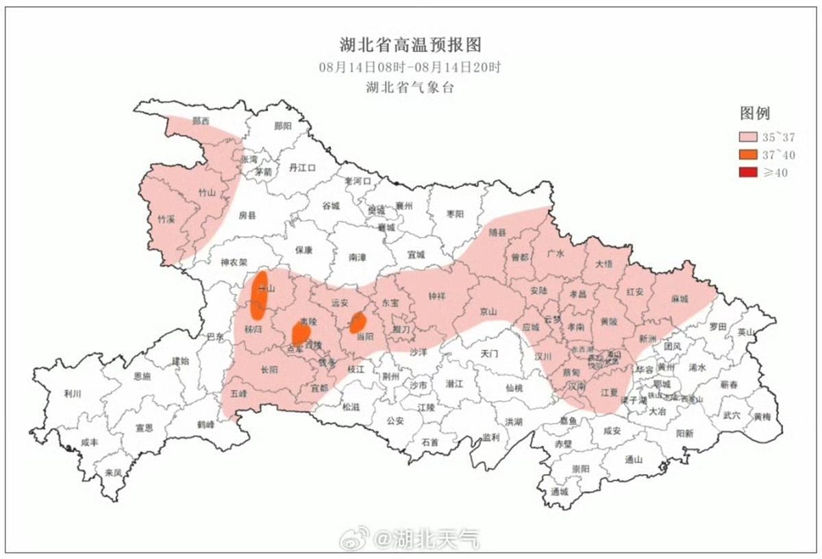 湖北省气象台2024年08月13日15时37分发布高温黄色预警:预计8月14日白天,十堰西部、宜昌、荆门、随州、孝感、武汉、黄冈北部最高气温将超过35℃,其中宜昌局地可达37℃以上。