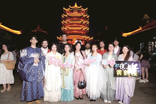 活动当晚,身着中式汉服与西式宫廷服的工作人员为游客带来中西合璧的迎宾式。千禧钟处,中西乐器现场合奏;鹅池之上,黄梅戏经典选段《鹊桥相会》上演。景区“月老”与“小红娘”还邀请国内外游客诵读自己国家的爱情诗歌。《夜上黄鹤楼》七夕限定版光影秀,更是将节日的氛围拉满。