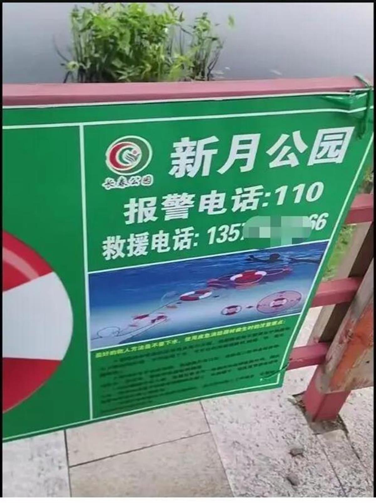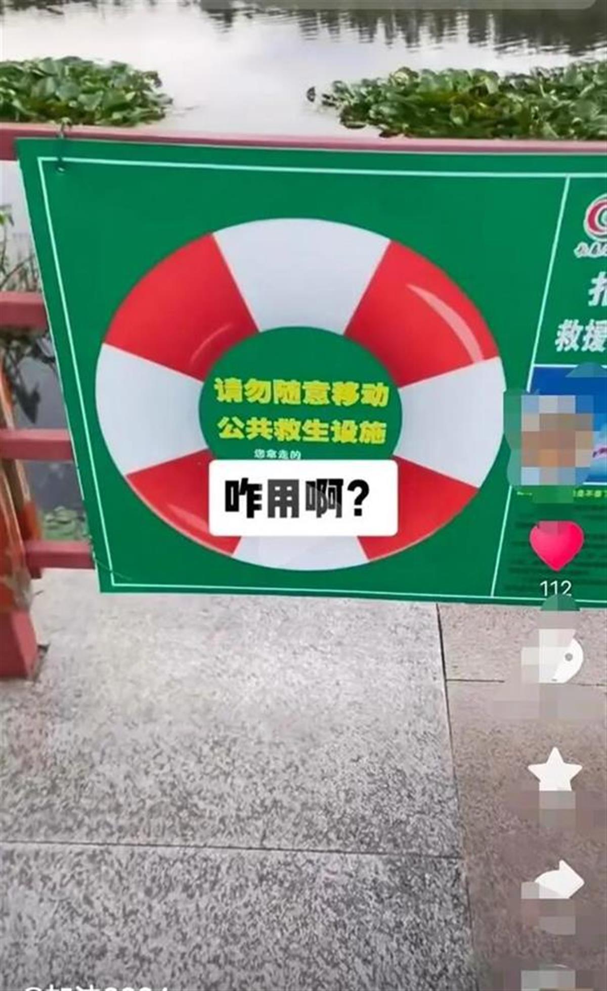 视频显示,在新月公园的水域旁,设置的牌子上画了一个救生圈,还写有“请勿随意移动 公共救生设施”“您拿走的 也许是他人的生命”的警示语。